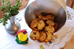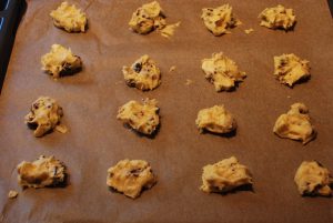Sett deigen med en teskje på bakepapir på stekeplaten og trykk dem litt ned. Jeg fikk 32 kjeks fordelt på to plater. Stek dem midt i ovnen ved 200 grader i ca. 10 minutter. Du må følge med så de ikke brenner seg. OBS når de begynner å bli brune i kantene.