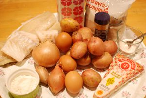 Smelt smøret i en kjele, surr oppdelt løk i et par minutter, ha over melet og rør rundt. Spe gradvis med den varme melken. La sausen koke et par minutter. Skill eggene. Ha revet parmesan og eggeplommer i sausen, smak til med kajennepepper (eller annen pepper evt. revet muskat hvis du ikke har kajennepepper). Ha i oppdelt fisk og potetskivene. Pisk eggehvitene og vend dem forsiktig i sausen.  Hell gratengen i formen/former og strø godt med brødstrø over. Tilslutt heller du olje over. I den opprinnelige oppskriften står det 1/2 dl. Så mye har aldri jeg brukt, men det er bare å prøve seg fram.