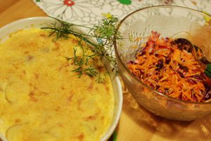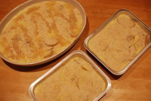 Denne fiskegratengen har jeg laget mange ganger. Det er en «alt-i-ett» rett. Selv om det tar litt tid å lage den og det blir mye oppvask er det lettvint når den skal serveres. Salat høre med og den kan lages når retten står i ovnen. Til fiskegrateng synes jeg det passer godt med  råkost, men lag salat av det du har i kjøleskapet. Denne retten holder til fire sultne. Siden vi bare var to denne gangen lagde jeg to små ved siden av som kan fryses og stekes senere. Oppskriften passer til en ildfast form som måler 24 x 33 cm.Jeg bruker ofte frossenfisk (blokk) til denne retten og det fungere veldig fint.