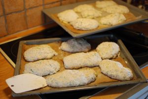 Alt blandes, heves, manøvreres over på to stekebrett og etterheves før de stekes. Se fremgangsmåte under innlegget «Saftige rundstykker». Deigen er klissete, men det er verdt det…