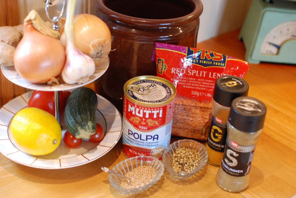 Jeg startet med å legge linsene i vann/vaske dem. Ha rikelig med olje i ei gryte og ta i alle krydderne og la de frese et par minutter før du tar opp i hakket hvitløk, løk og ingefær. Stek dette noen minutter før du tar i tomatene, de avrente linsene og vannet. Så lar du det hele koke og kose seg på svak varme så lenge du har tid minst en halv time gjerne dobbelt så lenge. Smak til med salt og sitron, det trengs.