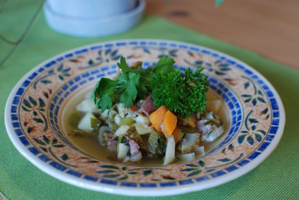 Jeg har vært på Gjerirampa (se Facebook)og kjøpt kortreiste grønnsaker og det gav meg inspirasjon til grønnsaksuppe. Som vanlig ta det du har. Her er et forslag. Rester og stilker som ligger i grønnsaksskuffen kan du bruke i suppa. Løk, laurbærblad og grønnsakbuljong er greit å ha som basis. For litt ekstra smak stekte jeg tre oppdelte skiver med bacon også. Det er ikke nødvendig. Har du en pølserest kan det brukes.