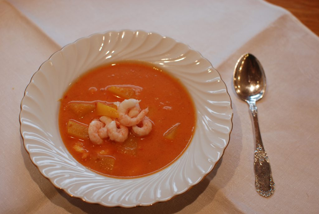 Bloggen er 5 år og denne suppa kan også kalles Jubileumsuppe! Jeg fikk den servert for 10 år siden som en forrett til en god middag. Siden har jeg i alle fall lagd den en gang i året; til jul. Den kan lages hele året du bestemmer selv hvor luksuriøs du vil lage den. Hvis du velger billige reker og mager fløte blir det en hverdagsuppe. Denne gangen ble det en blanding for meg; «dyre» reker og mager fløte.